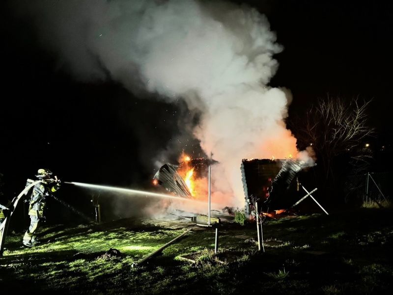 Brennt Gartenhütte - Eine Gartenlaube wurde mittels eines C-Rohres durch einen Trupp unter Atemschutz abgelöscht. Im Anschluss wurden Batterien in einem Wasserbehälter heruntergekühlt.