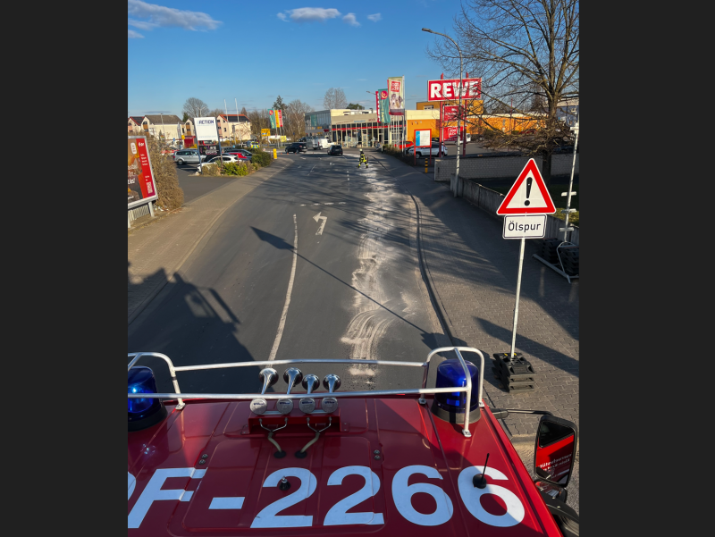 Betriebsmittel aufnehmen - Es wurde eine etwa 300m lange Ölspur mittels Bindemittel abgestreut, um die Verunreinigung auf dem Fahrbahnbelag aufnehmen zu können. Außerdem wurden zur Sensibilisierung der Verkehrsteilnehmer Warnschilder aufgestellt.